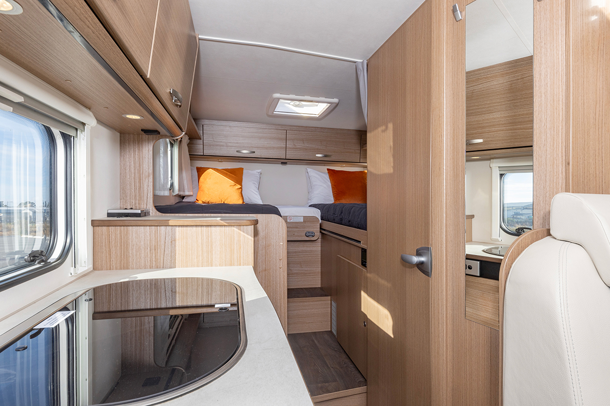 Longer than our Compact for 2 but still relatively short in length, the two berth Compact Plus motorhome features a significantly bigger bed — when set up as a king size.